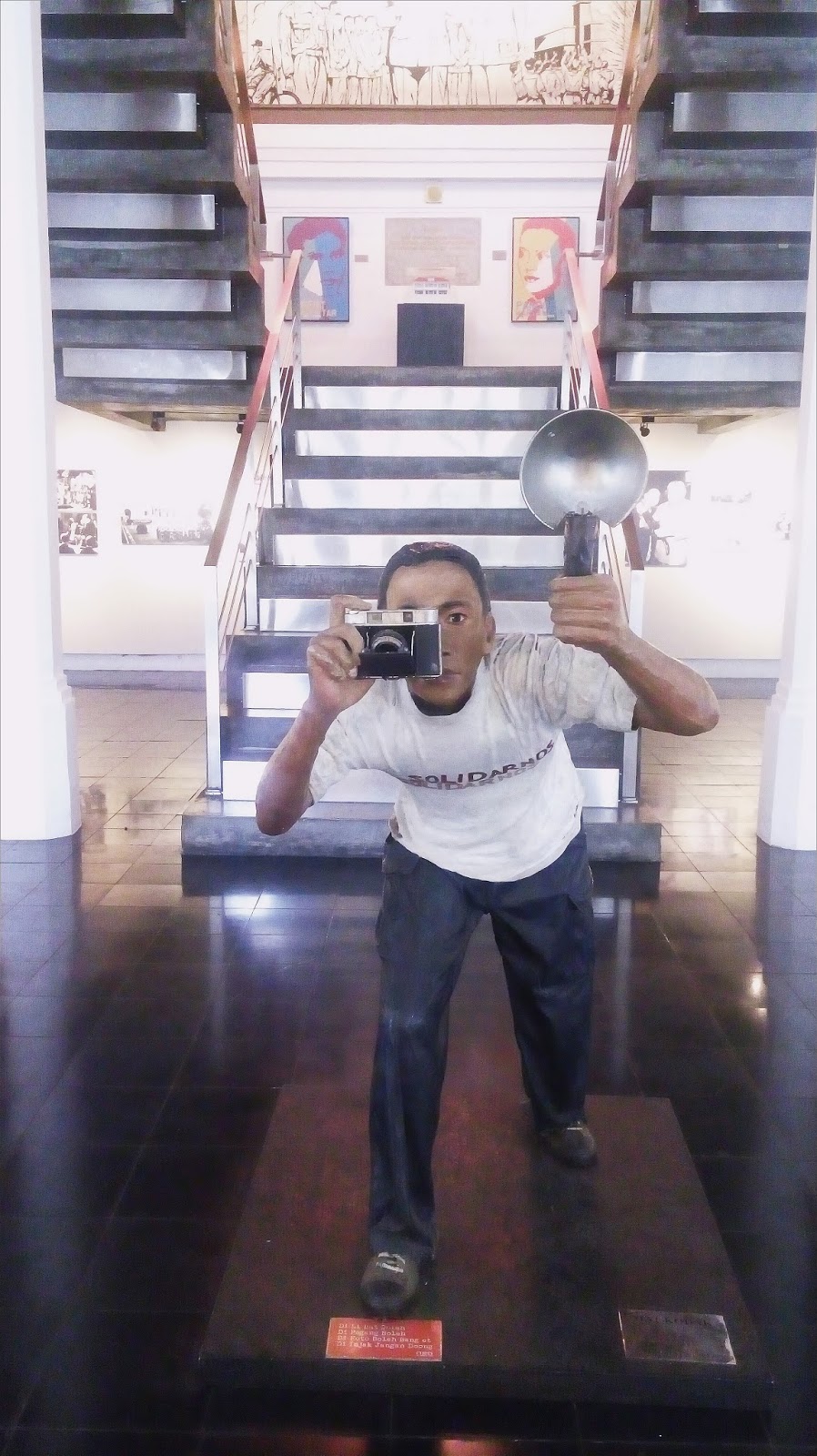 Museum dan Galeri Foto Jurnalisitik ANTARA ini memiliki dua lantai. Pada lantai pertama, terdapat koleksi foto-foto jurnalistik. Kebanyakan foto-foto kegiatan Presiden RI dari Pak Sukarno sampai foto terbaru dari Pak Jokowi. Foto yang cukup menarik perhatian saya adalah foto saat iring-iringan mobil jenazah Pak Abdurrahman Wahid (Gus Dur). Tapi sebelum itu....kita sambut oleh patung fotografer dengan kamera zaman dahulu, yang (selalu) ngagetin saya. Hahaha!
